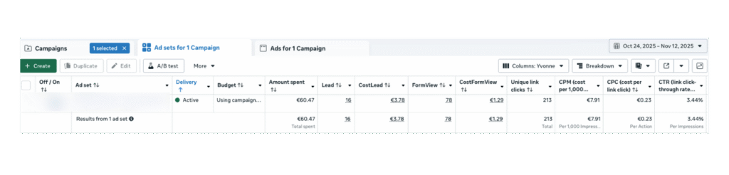 En 60 días: 72 contactos llenaron un formulario detallado de 8 preguntas con 433,21 € de inversión – 6 € por cada lead de calidad prácticamente filtrado
